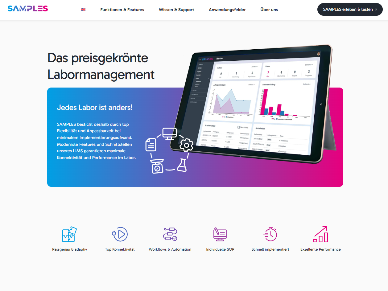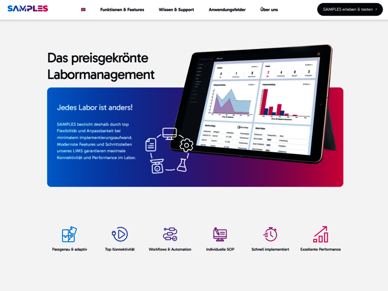 SAMPLES - unser preisgekröntes LIMS, ELN und LES besticht durch außergewöhnliche Flexibilität und Anpassbarkeit. Der Anwender verbindet sich mittels hoch performanter, offener Schnittstellen mit den gewünschten Applikationen und Geräten. So garantiert das „Produkt des Jahres 2025“ der LABO-Leser maximale Performance und Konnektivität – vom komfortablem Proben- und Datenmanagement über die Umsetzung individueller Schritt-für-Schritt-Anleitungen (SOP) bis hin zur einfachen Realisierung automatisierter Workflows.